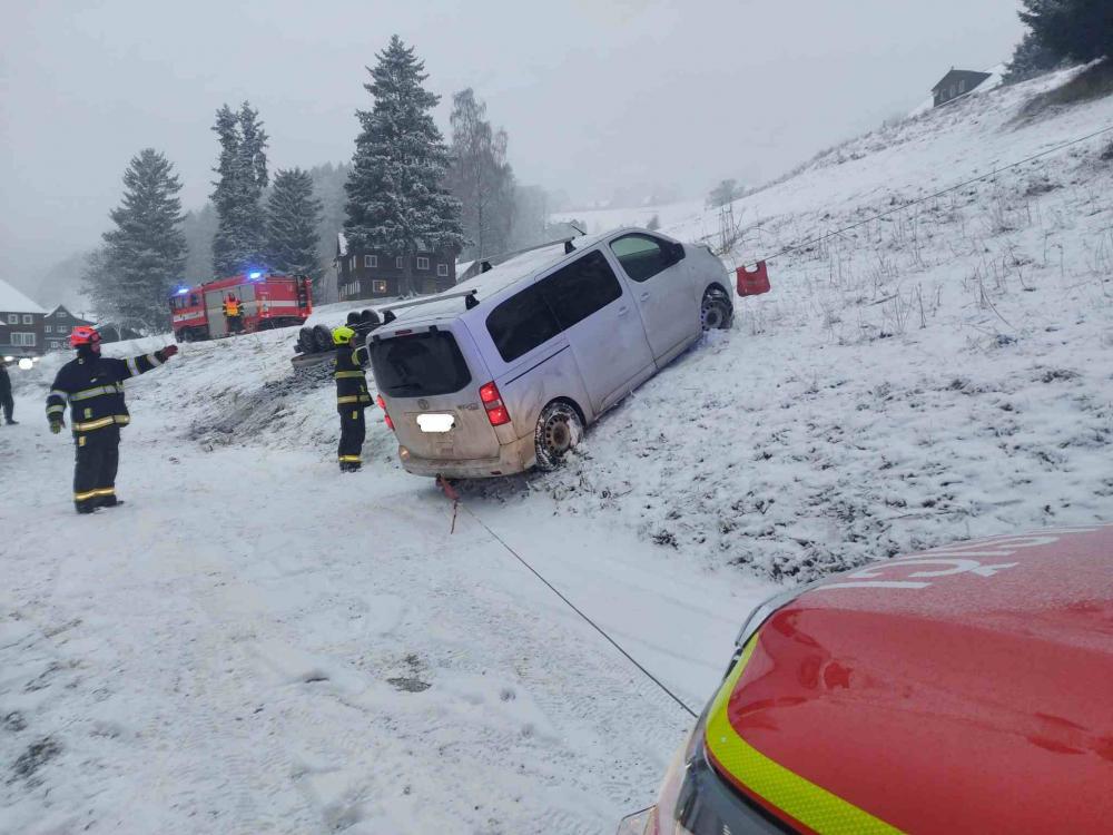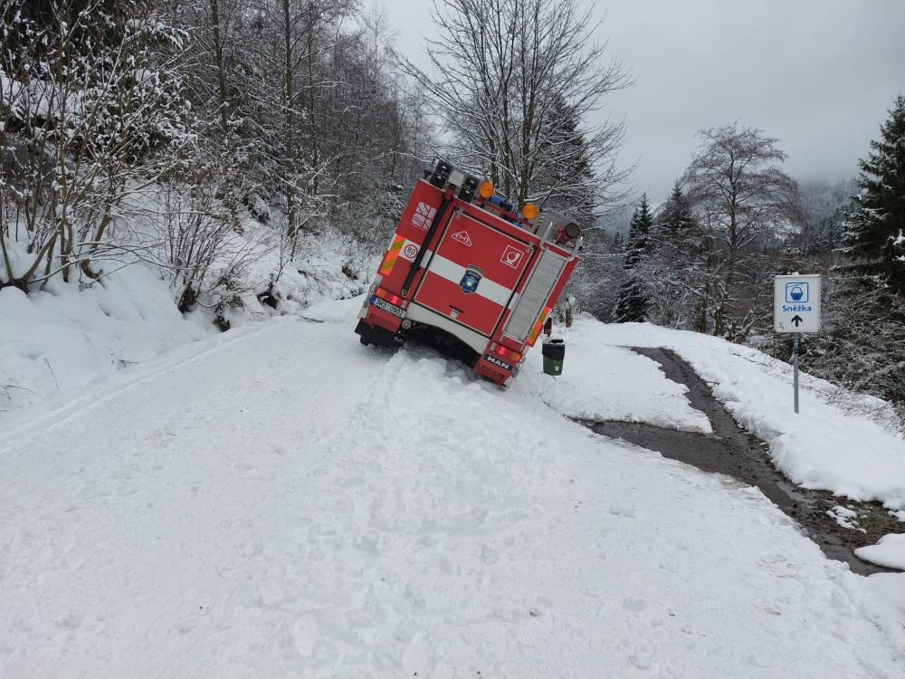 | 1. 1. 2016 | Nehoda Dne 01. 01. byl v 16:37 vyhlášen poplach –nehoda, uvolnění, Velká Úpa, Bouda na Cestě. Na místě události bylo zjištěno MPV, ktreré se dalo na zledovatělé cestě samovolně do pohybu a skončilo asi 100 metrů pod cestou v řadě smrků. Protože ani jedno hasičské vozidlo nedisponovalo dostatečně silným lanovým navijákem, který by vozidlo bezpečně vytáhl zpět na komunikaci, z vozidla neunikaly žádné provozní kapaliny a nebránilo provozu na komunikaci, bylo rozhodnuto velitelem zásahu o odložení vyproštení automobilu na druhý den ráno. Ze stanice HZS v Trutnově bude posláno vozidlo se silnějším navijákem. |