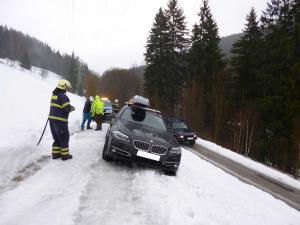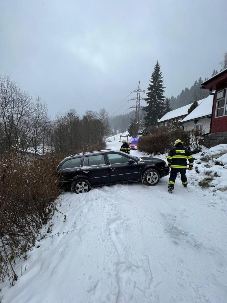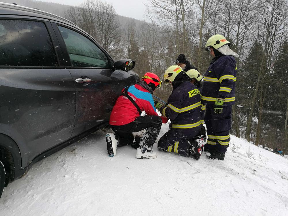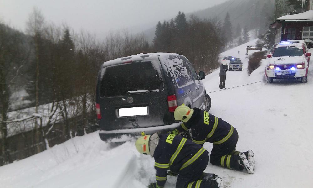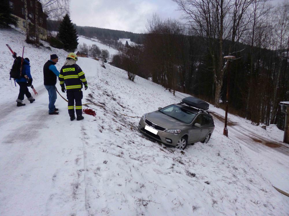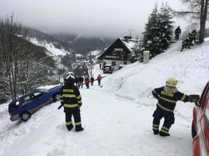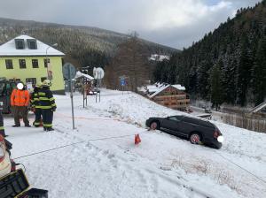| 6. 1. 2017 | 3: Vyproštění vozidla V 10:51 byl jednotce vyhlášen poplach – pomoc, nebezpečný stav, auto uklouzlo na hranu svahu, hrozí pádem ze svahu, Penzion Alena. Osobní automobil se dostal částečně mimo místní komunikaci. Po příjezdu na místo bylo vozidlo zajištěno proti dalšímu pohybu lanovým navijákem na DA Mazda. Po příjezdu TA z PS Trutnov byla jejich navijákem zajištěna zadní část vozu proti možnému pádu za svahu a vozidlo bylo pak vytaženo zpět na komunikaci. Zúčastněné jednotky: JSDH Pec pod Sněžkou, HZS PS Trutnov |