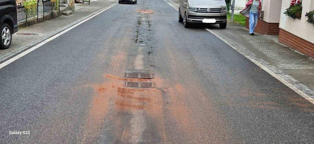 V 10:14 je jednotka povolána k úniku nebezpečné látky, nahlášeno v délce asi 200 metrů. Na místě následně zjiš»ujeme únik hydraulického oleje z domíchavače betonu v délce cca 2 km. Sorbentem obsypáváme kanálové vpusti a nejvíce zasažená místa na komunikaci. Vlivem vytrvalého deště došlo k rychlému naředení uniklé látky. Použití sorbentu v celé délce komunikace bylo s ohledem na minimální obsah látky neefektivní.