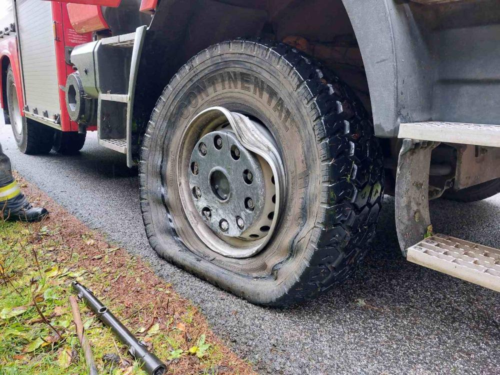 Cestou na místo události došlo k poškození naší CAS, kdy bylo o kámen hned vedle cesty proraženo pravé přední kolo.
