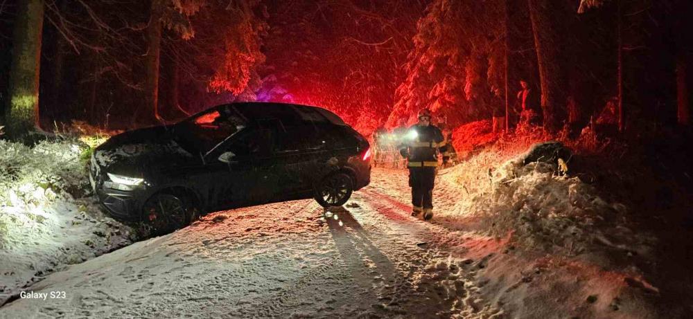 Ve 09:53 je jednotka povolána k automobilu mimo komunikaci, hrozícímu převrácením na střechu. Na místě provádíme zajištění vozidla a ve spolupráci s HZS za použití dvou ručních lanových navijáků a navijáku na TA vyproš»ujeme vozidlo bez poškození zpět na komunikaci. Vzhledem k zabržděnému vozidlu a vybité baterii auto není schopné pohybu. Využíváme nabídky majitele přilehlé chaty a startujeme automobil za pomoci vypůjčených startovacích kabelů.