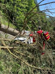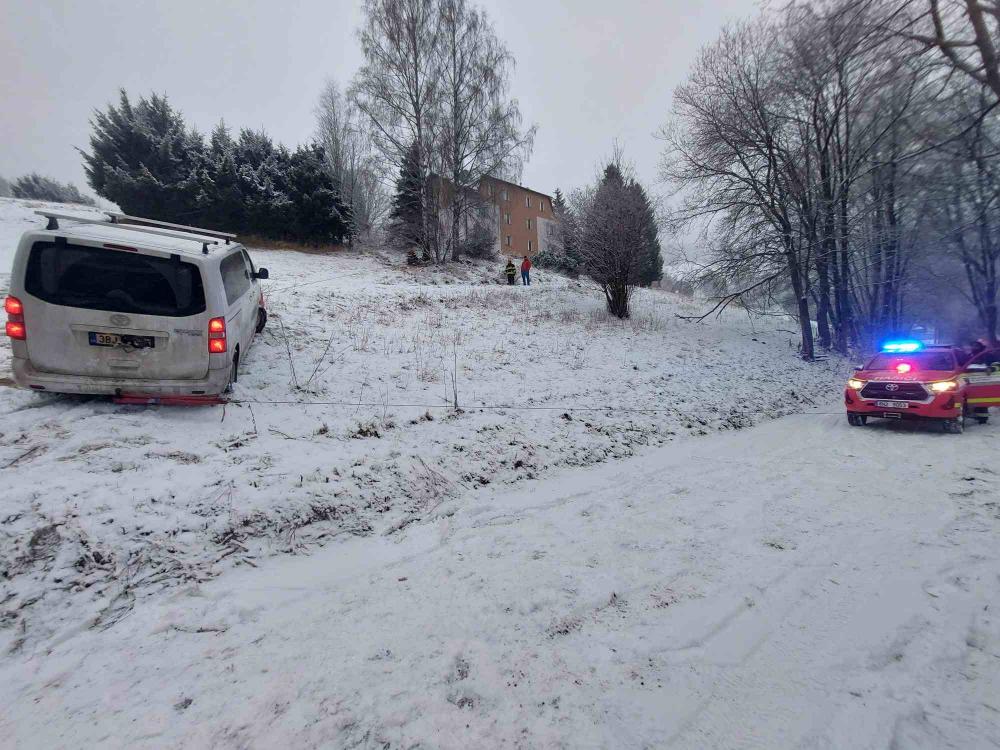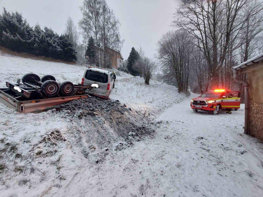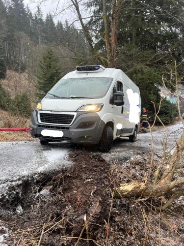| 15. 12. 2024 | 116: Vyproštění vozidla Ve 12:40 je jednotka povolána do Velké Úpy, kde došlo na kluzké vozovce k sjetí dodávky částečně mimo komunikaci do srázu. Řidič se nacházel ve vozidle a stál na brzdě. Vozidlo jsme zajistili proti pohybu ručním lanovým navijákem a vyproš»ovacími kurtami, vzhledem k nejbližšímu kotvícímu bodu ve vzdálenosti asi 40m. Za zadní část bylo vozidlo uchyceno navijákem na TA a vyproštěno zpět na komunikaci bez poškození. K bezpečnému sjetí bylo třeba auto jistit pod nejprudší část komunikace. K tomu byl využit také ruční lanový naviják z výbavy HZS. |