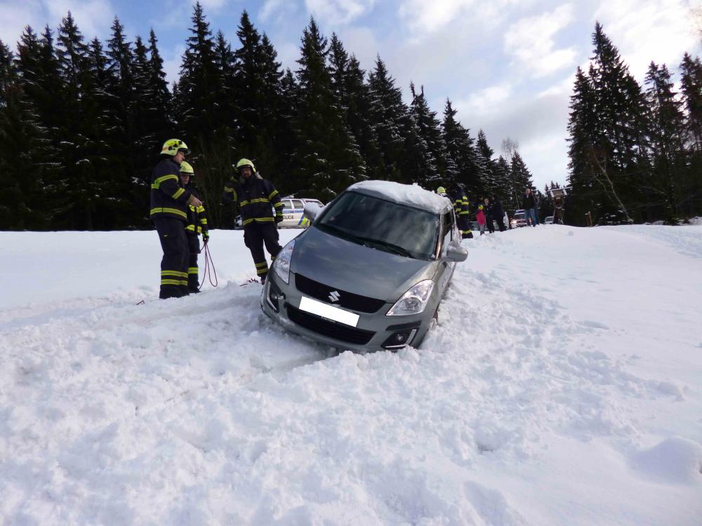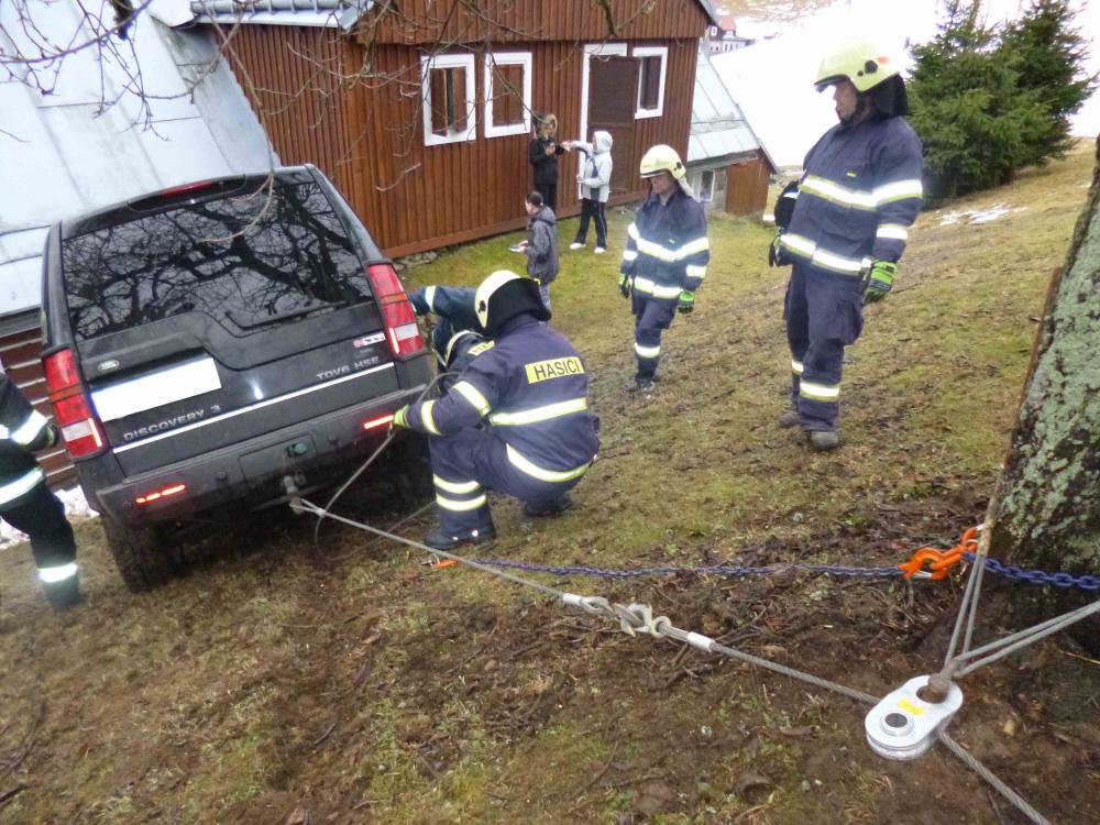 | 1. 2. 2016 | Vyproštění vozidla Dne 1. 02. byl v 8:54 vyhlášen poplach –nehoda, uvolnění, chata Amor, na výjezdové cestě - malé osobní auto sjelo z cesty, hrozí pádem ze stráně. Vozidlo jsme vytáhli zpět na komunikaci pomocí navijáku umístněného na DA Mazda. Zúčastněné jednotky: JSDH Pec pod Sněžkou, HZS PS Trutnov |