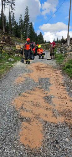 Ve 20:11 je jednotka povolána do Pece pod Sněžkou kde došlo k úniku menšího množství nafty na komunikaci. Zjiš»ujeme znečištění v délce cca 500m vlivem mokré komunikace, zasypáváme pouze dvě místa s větší plochou znečištění.