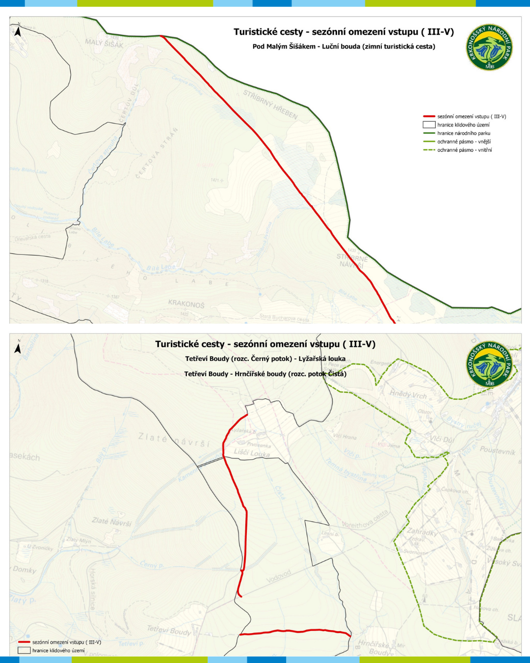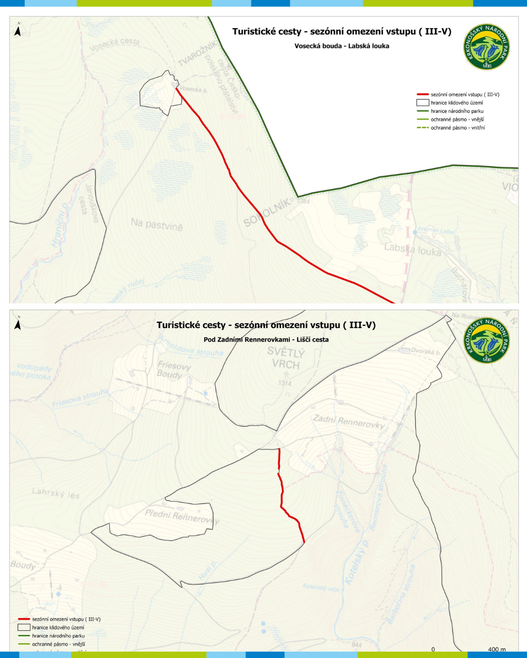 (1) Žlutá turistická cesta ve směru ze Zadních Rennerovek na Hanapetrovu Paseku, vedoucí po hranici klidového území v úseku Pod Zadními Rennerovkami až cyklotrasa Liščí cesta (opatření obecné povahy Správy KRNAP č. OOP 6/2020).